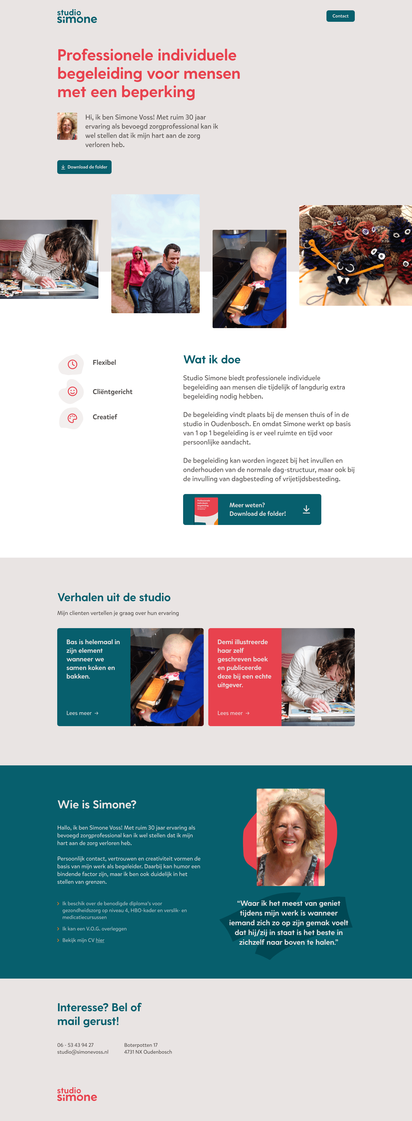 De website voor Studio Simone is een goede aanvulling op de brochure, met ruimte voor verhalen van cliënten en meer beleving door foto's. Ik heb ze ook zelf gebouwd in Framer.