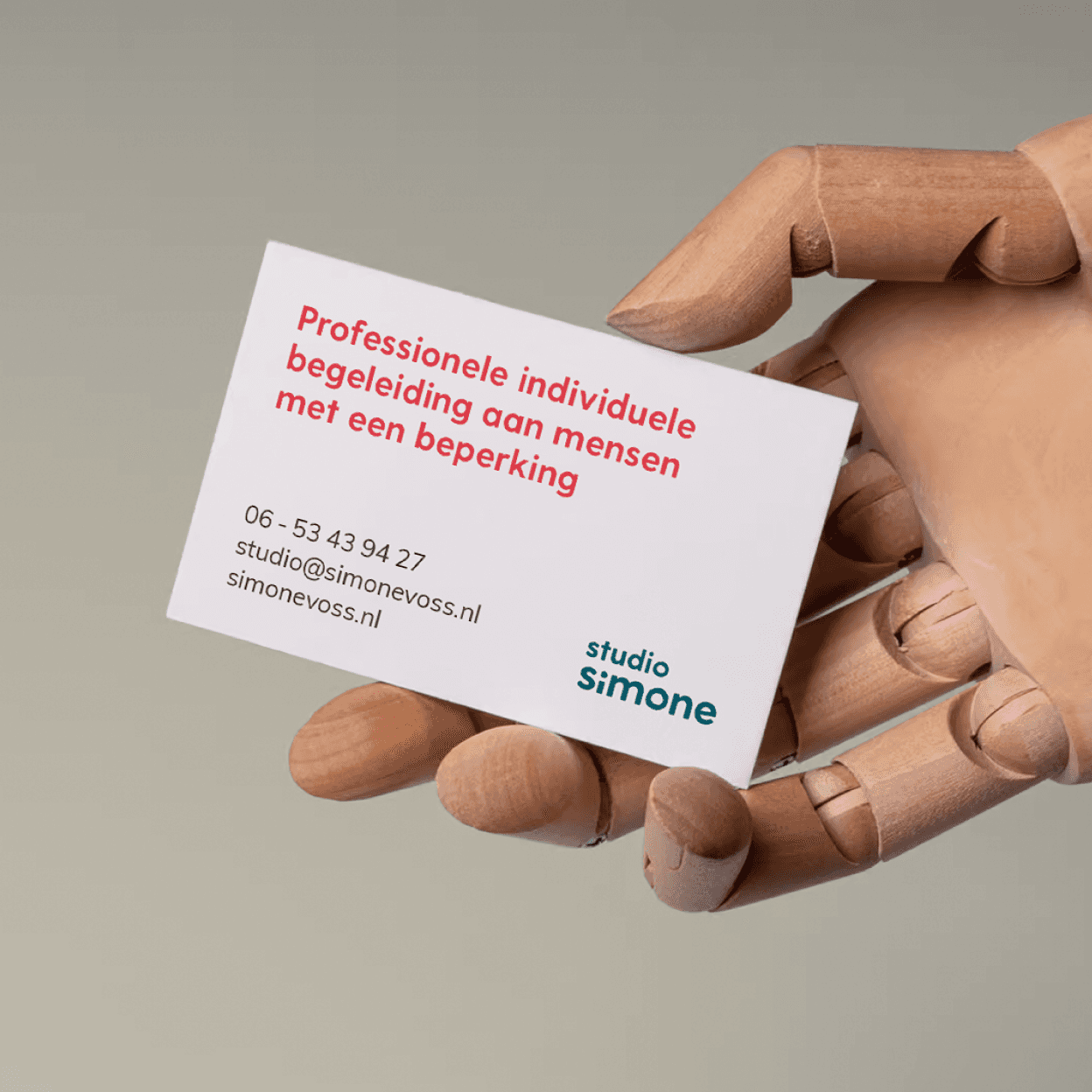 Door middel van een aantal sessies kwamen we tot een visuele identiteit die vriendelijk aanvoelt, en de creativiteit en informele sfeer van Simone uitstraalt, maar wel helder blijft. Daarnaast ontwierp ik een handzame brochure, visitekaartje en website.